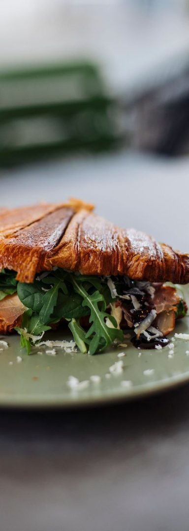 Sandwich aus 2 Croissant, belegt mit hausgemachtem Pesto, Burrata, feinstem Schinken, Ruccola und Parmesan